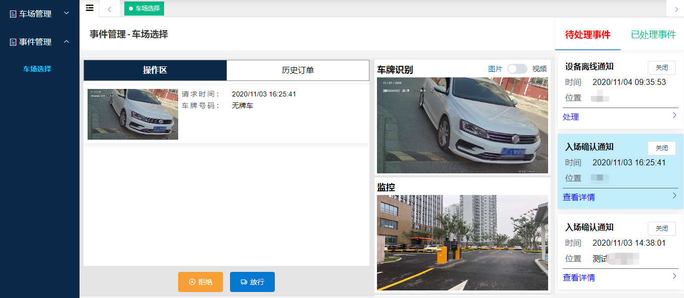 運(yùn)維后臺可同時查看所管轄的多個車場的通道視頻、操作抬桿/落桿、接聽現(xiàn)場呼叫以及處理異常事件
