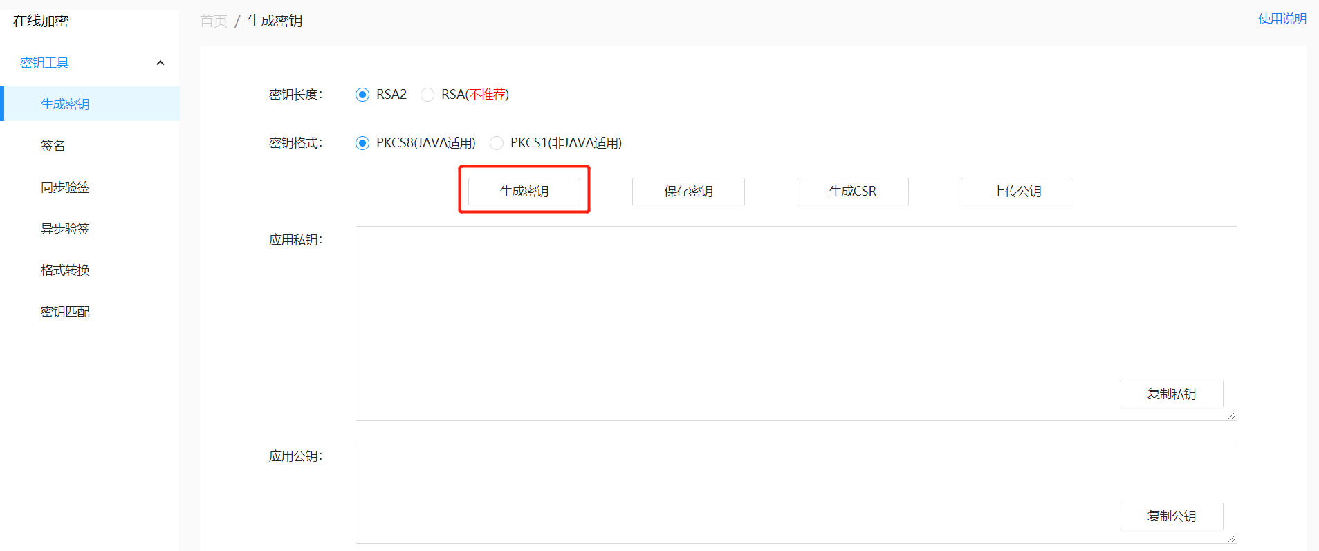 公私鑰在線(xiàn)生成工具地址:https://miniu.alipay.com/keytool/create